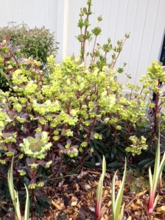 Purple euphorbia is an evergreen plant that is drought tolerant. It puts out chartreuse flowers in the spring. It grows to be about 2 feet tall.
